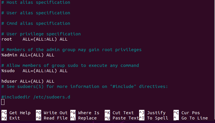 5.5. Exit from root user and add the 'hduser' to sudoers list so that hduser can do admin tasks.