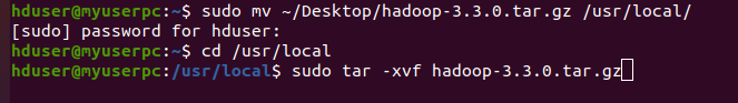 $ sudo mv ~/Desktop/hadoop-3.3.0.tar.gz /usr/local/