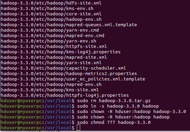For moving the zip file to /usr/local/, go to /usr/local/, to unzip the file, to remove the tar file, to give short name of hadoop-3.3.0 (hadoop) and for permissions, please execute the following commands one by one in Ubuntu terminal.
