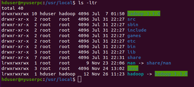 $ sudo ln -s hadoop-3.3.0 hadoop