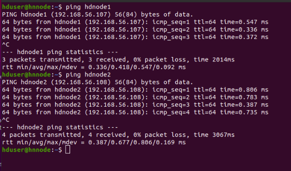 Let us test the ssh connectivity by doing the following. It will ask for yes or no and you should type 'yes'. Perform ssh hnnode/hdnode1/hdnode2 on each of the node to verify the connectivity.