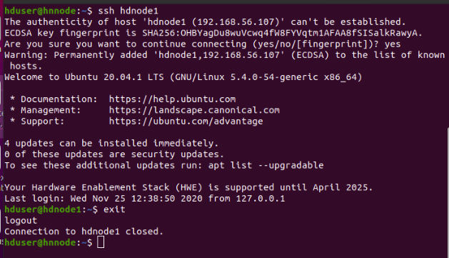hduser@hnnode:~$ ssh hdnode1 #Type Yes. It will connect to hdnode1