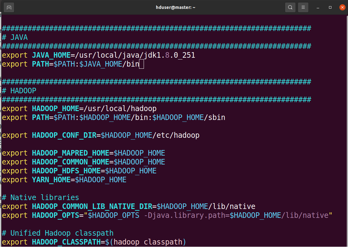 Hadoop cluster needs to configure the environment in which the Hadoop daemons execute as well as the configuration parameters for the Hadoop daemons. Setup the environment variables, edit ~/.bashrc file.